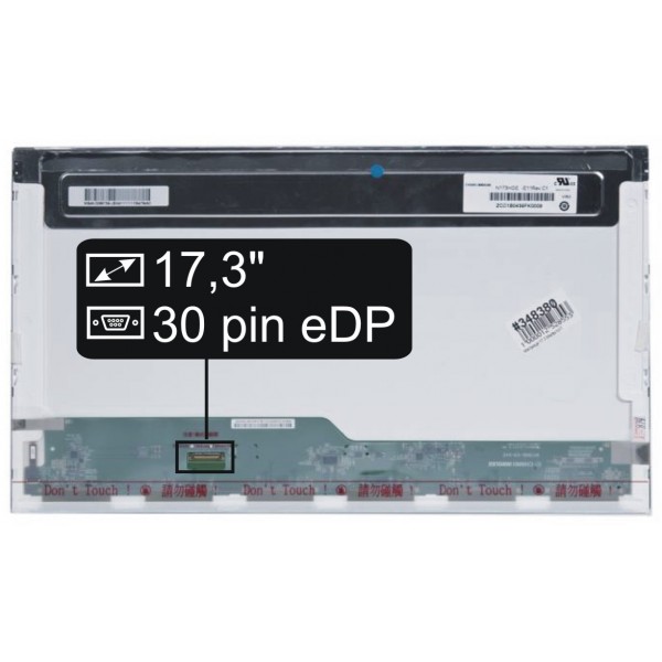 Základní údaje: velikost 17,3", rozlišení HD+ 1600x900, 30 pinový LED konektor umístěný na displeji vlevo dole (při pohledu na zadní stranu displeje).