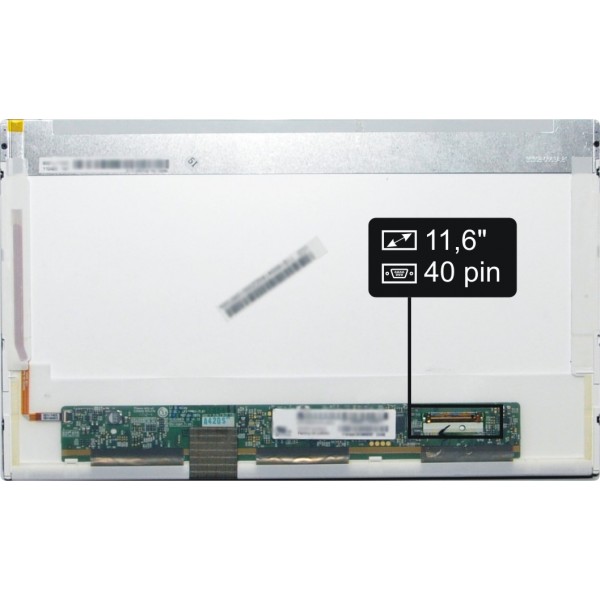 Základní údaje: matný povrch, velikost 11,6", rozlišení HD 1366x768, 40 pinový LED konektor umístěný na displeji vpravo dole (při pohledu na zadní stranu displeje).